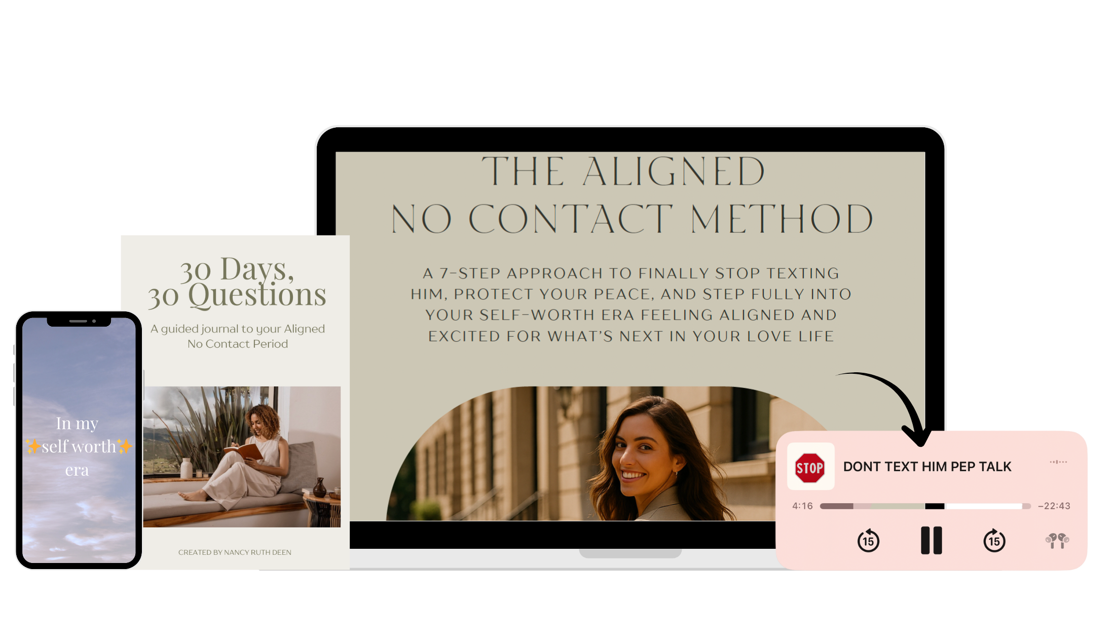 Inside The Aligned No Contact Method, you’ll move through 7 totally doable, natural, easy phases that help you go from anxious and unsure to excited, clear, and completely in your power.